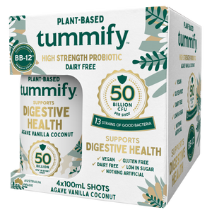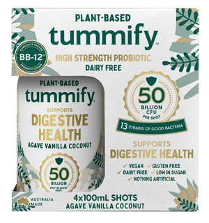 Tummify plant probiotic is a delicious agave vanilla probiotic shot. Designed to be taken daily, it is scientifically formulated to support your digestive tract and maintain overall good gut health. With over 50 billion live and active beneficial bacteria per bottle, this 13 multi strain formula does not compromise on performance. This product is ideal for vegans and allergen free lifestyles.